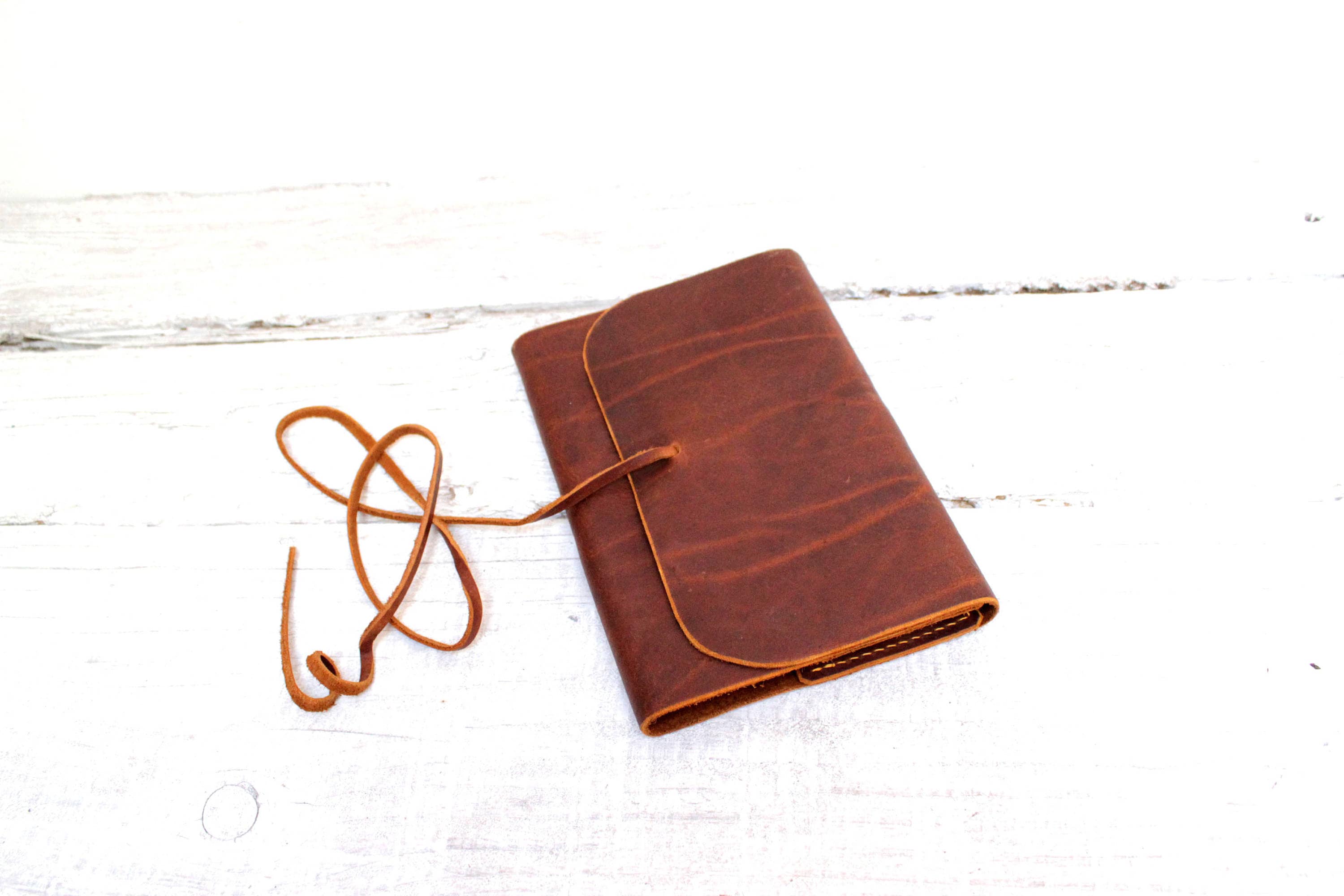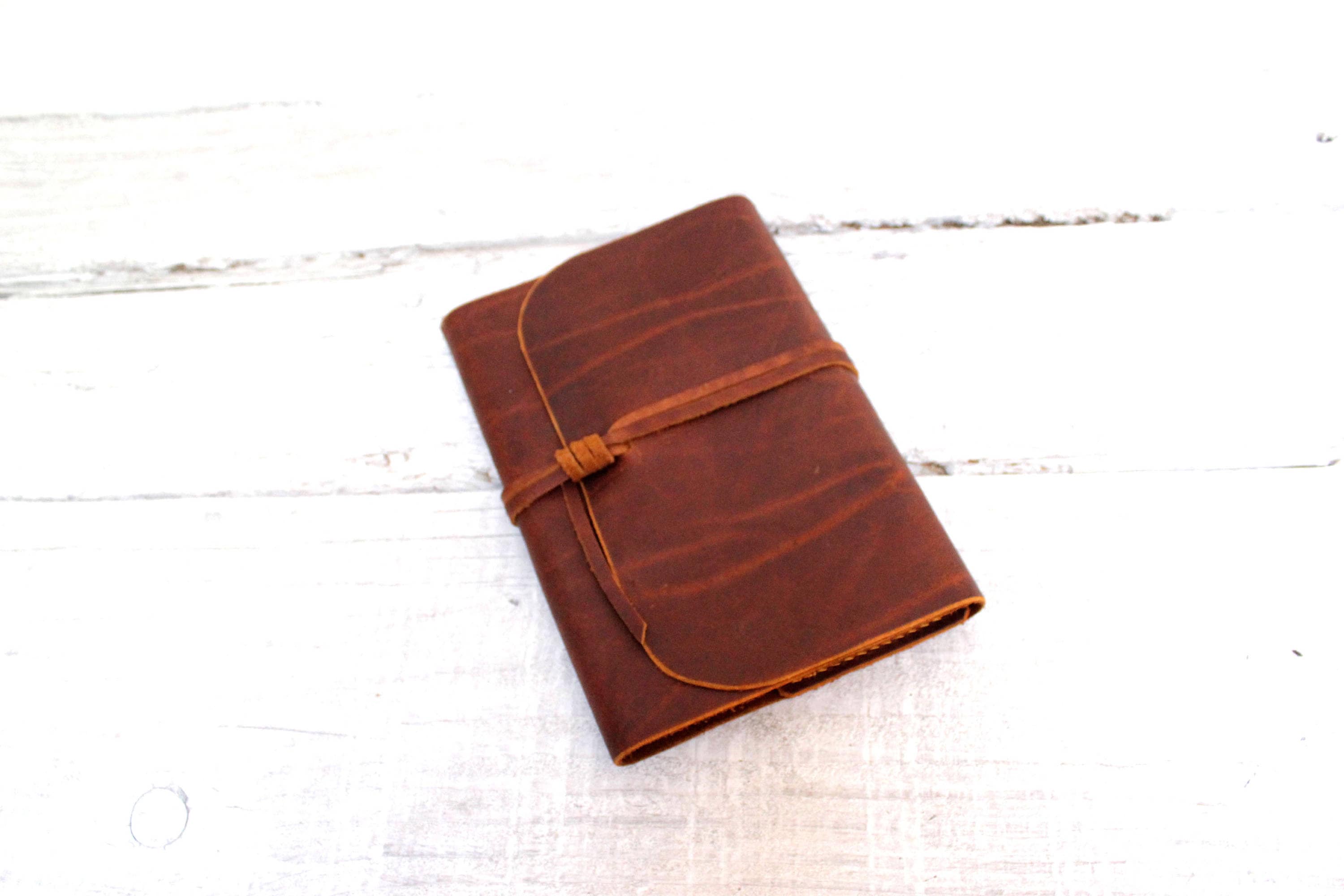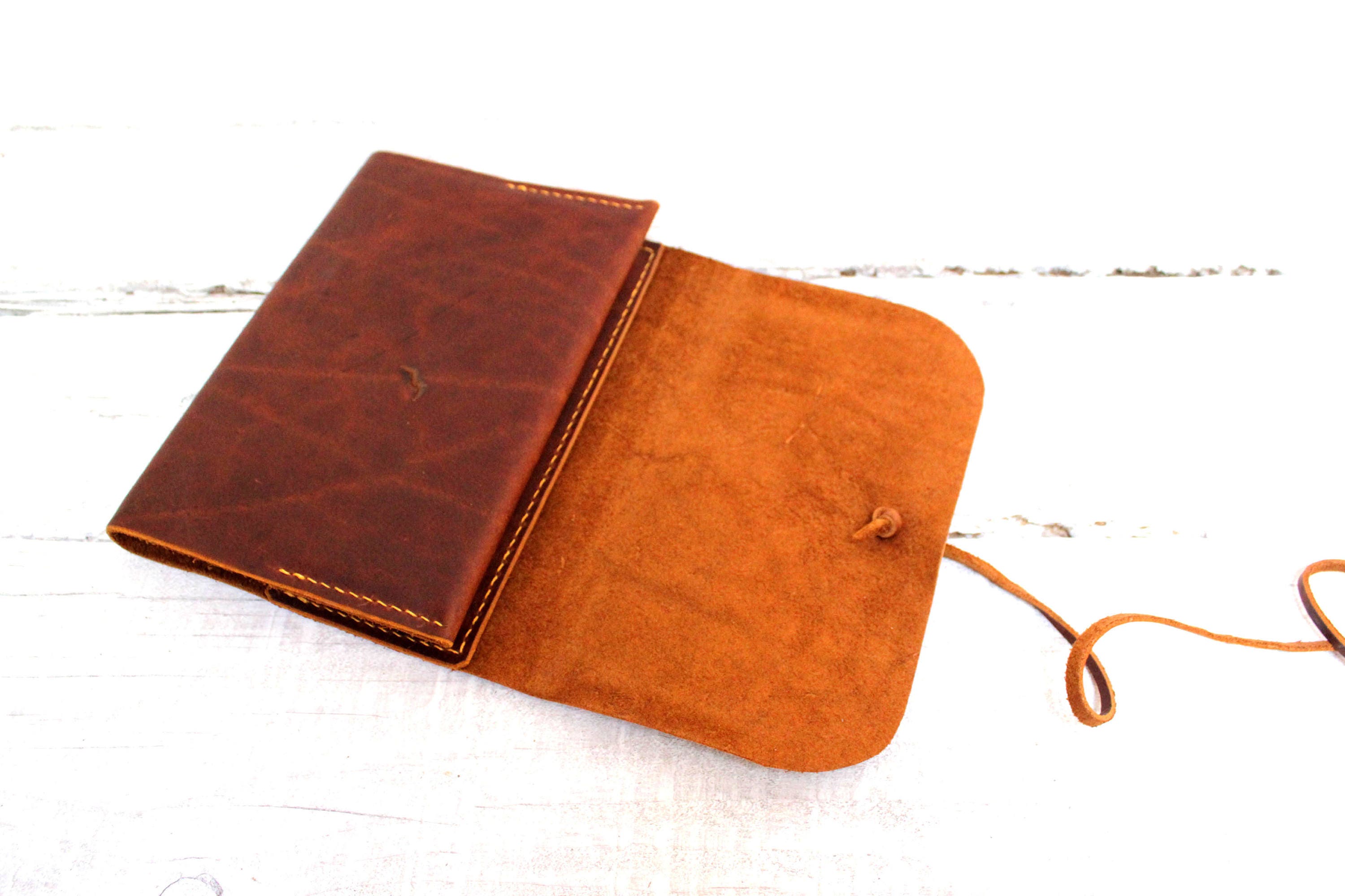 This is a unique refillable leather cover for an A5 notebook (148x210 mm or 5-7/8 x 8-1/4 inches) or book of similar dimensions.