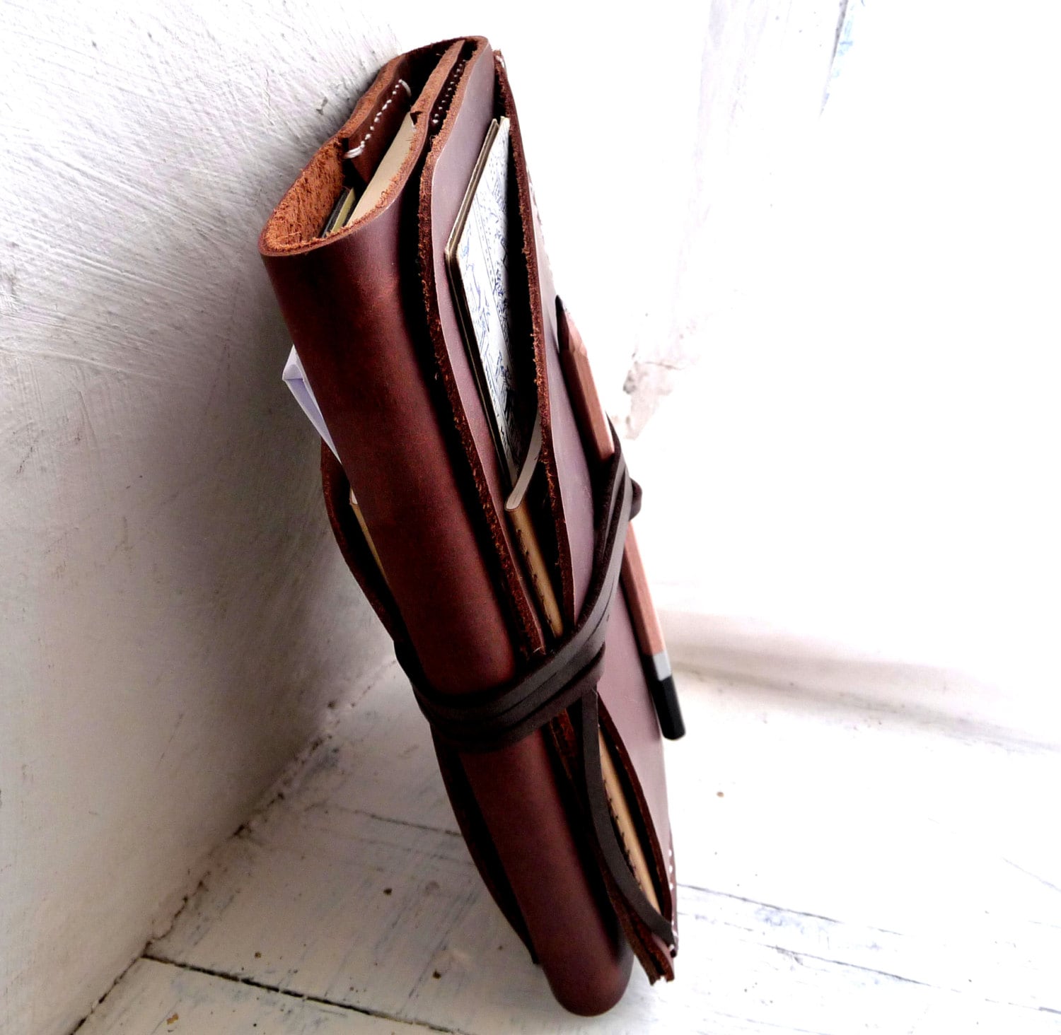 The leather used for the cover is a vintage brown, pull up cow leather which will age wonderfully with use. This Pull-up leather. (also known as waxy or oily pull-up) has a natural appearance which lightens in color when stretched or marked to produce a unique worn-in effect with time. The internal pockets are made using a thinner dark brown leather/