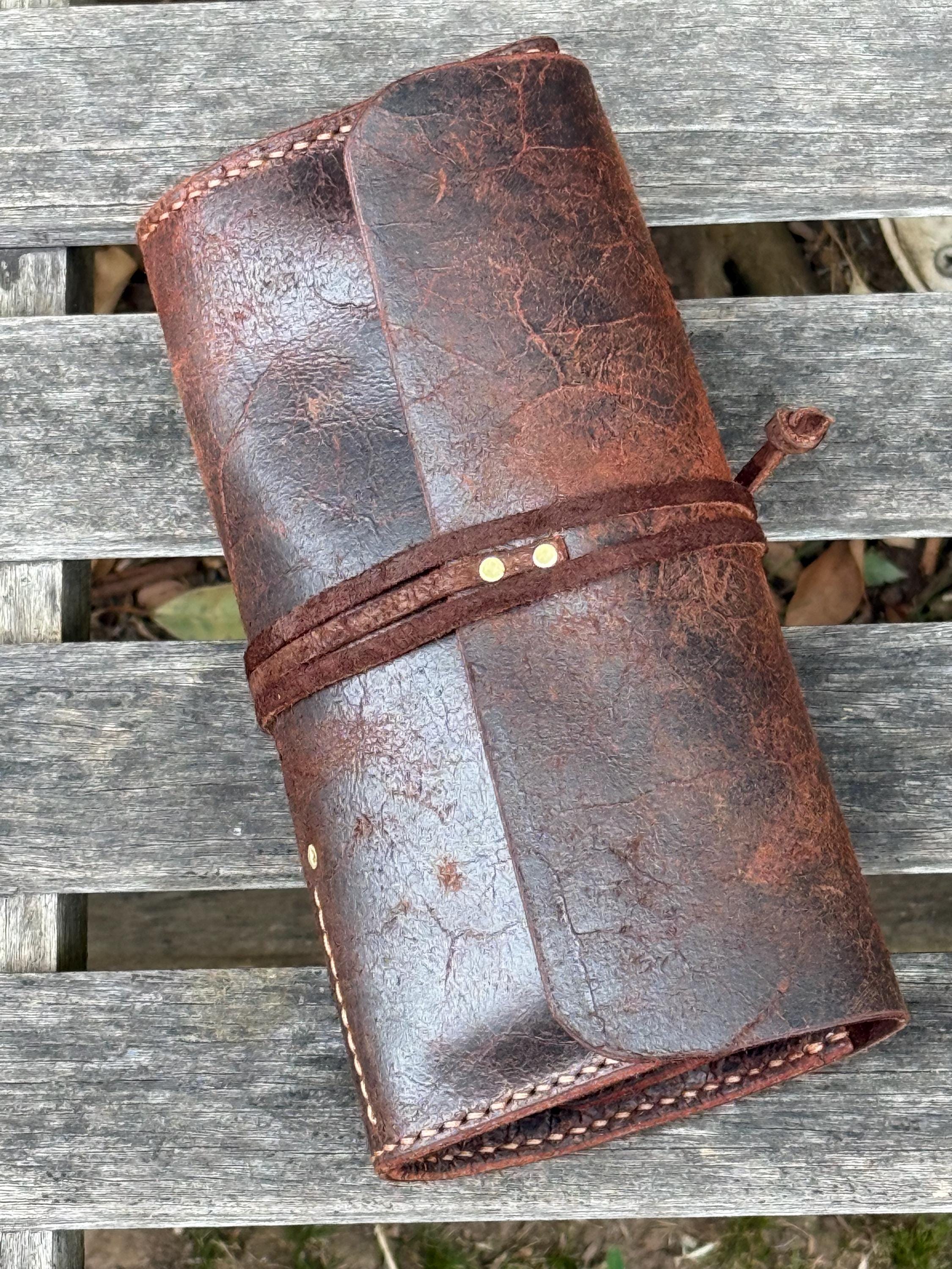 The leather used is a distressed espresso brown, pull up, cow leather that will get softer and more beautiful with use. You really need to hold this leather in your hands to appreciate it.