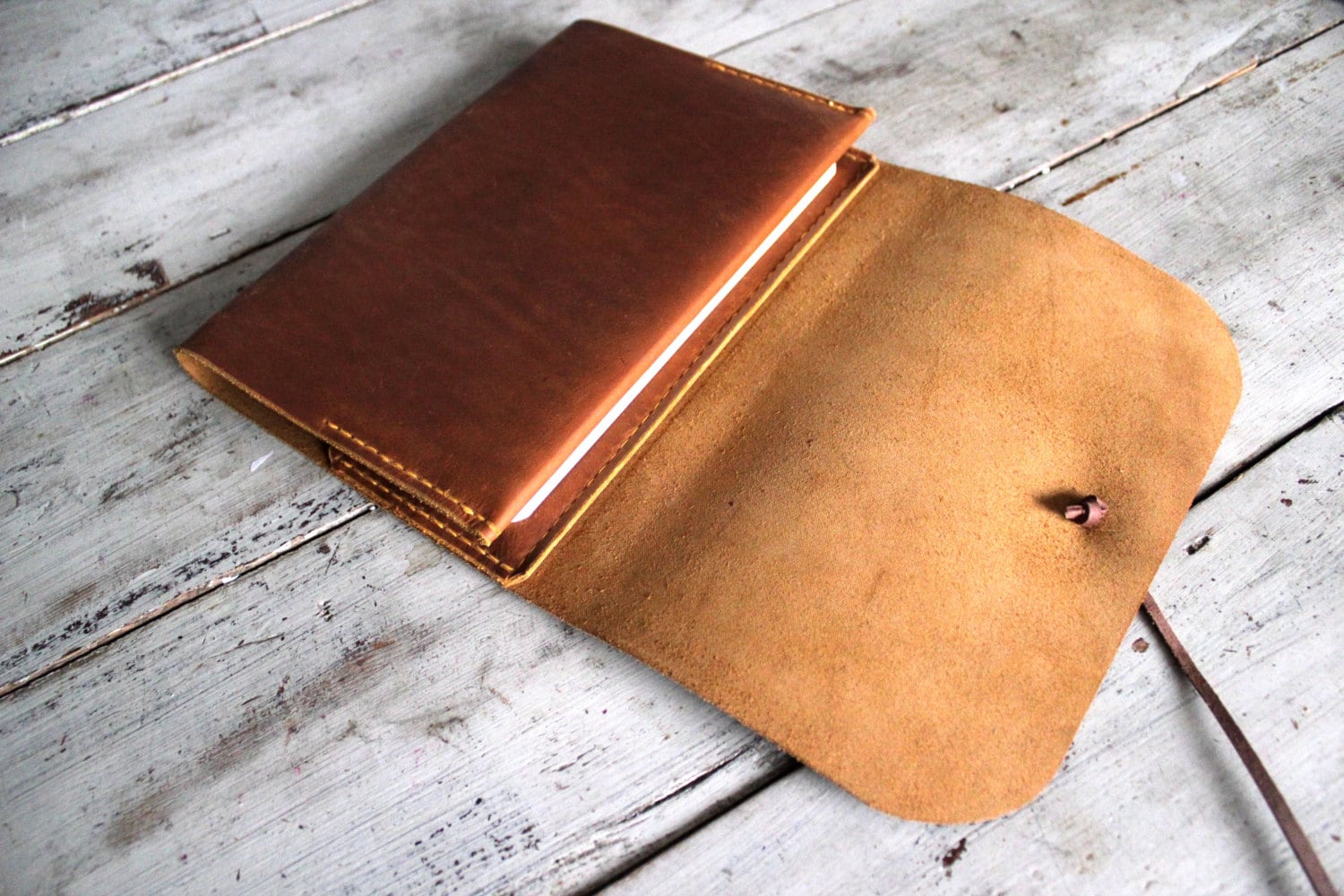 This is a unique refillable leather cover for an A5 notebook (148x210 mm or 5-7/8 x 8-1/4 inches) or book of similar dimensions.